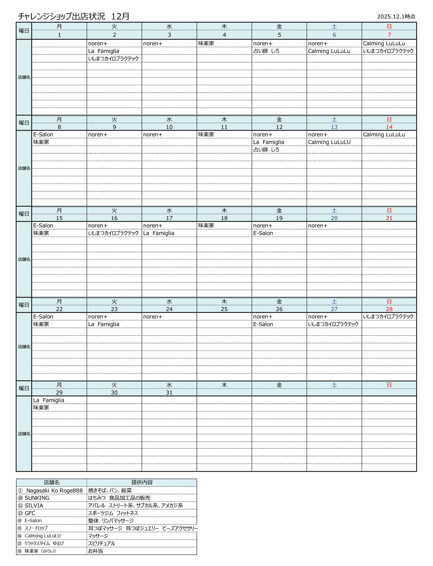 お知らせ させぼ四ヶ町商店街 「させぼ四ヶ町チャレンジショップ」12月出店カレンダー 2025年12月6日 「させぼ四ヶ町チャレンジショップ」、12月出店予定カレンダーは以下の通りです。 ぜひ四ヶ町にお越しの際はお立ち寄りください! →四ヶ町チャレンジショップの詳細はこちら チャレンジショップ12月カレンダー(PDF)ダウンロード チャレンジショップ12月カレンダー(PDF)ダウンロード Twitter Share Pocket Hatena LINE コピーする させぼ四ヶ町商店街のお知らせ させぼ四ヶ町商店街 お店TOPへ